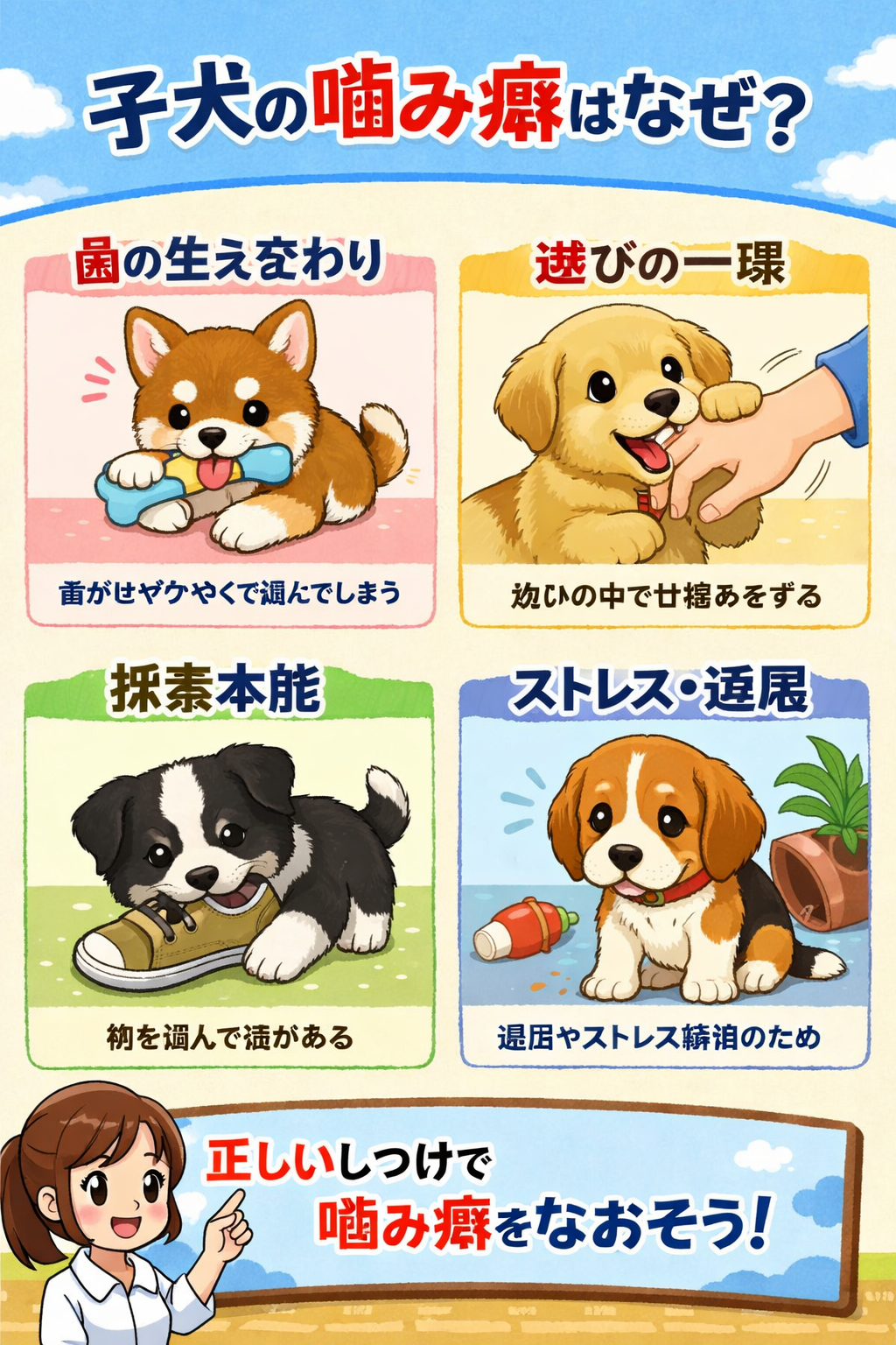 子犬(パピー)の頃に噛み癖が出るのはとても自然なことです。問題行動というより「成長過程の一部」であることがほとんどです。なぜ噛むのか、理由を詳しく解説します。