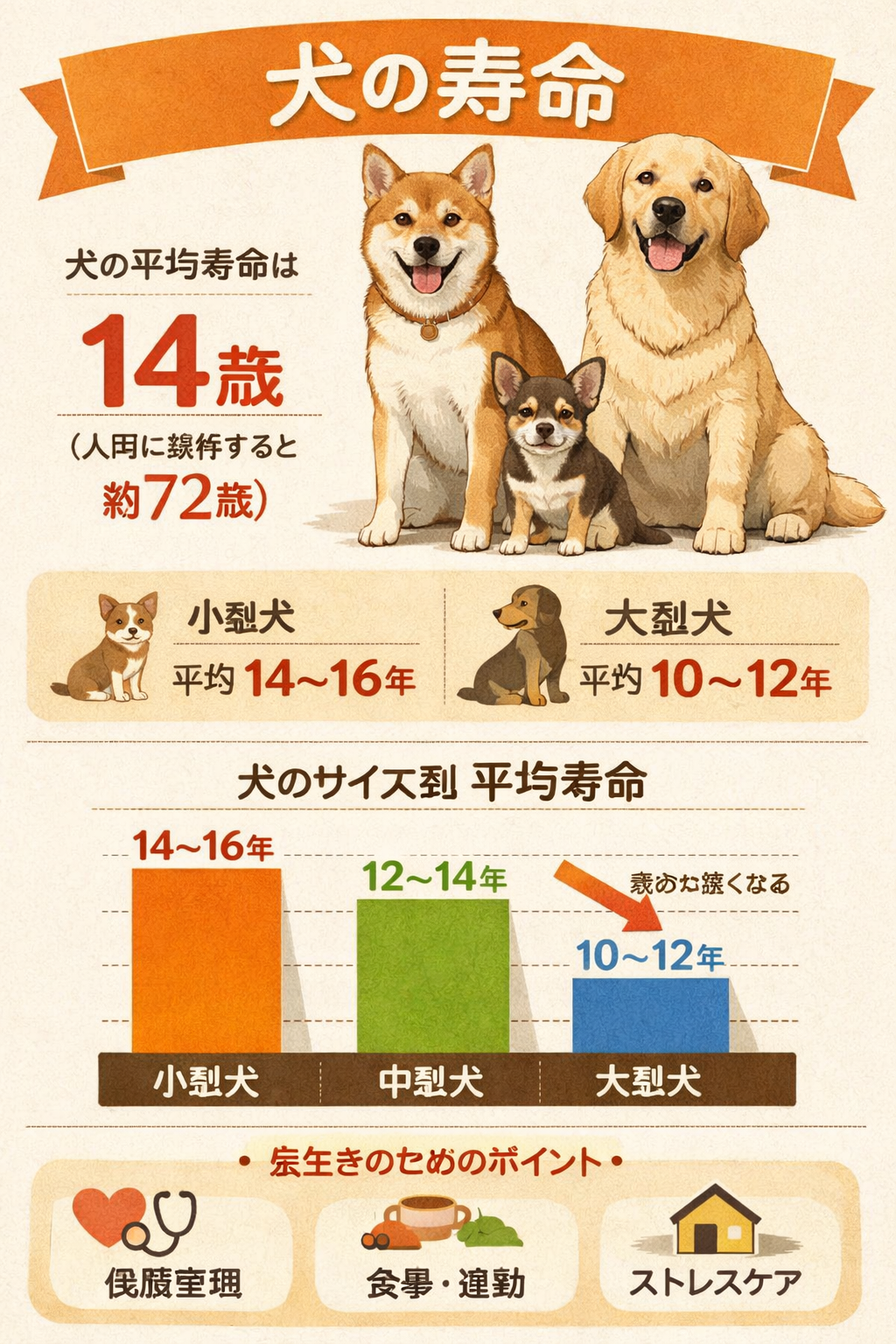 一般的な傾向として、小型犬ほど長生きし、大型犬ほどやや短いとされています。