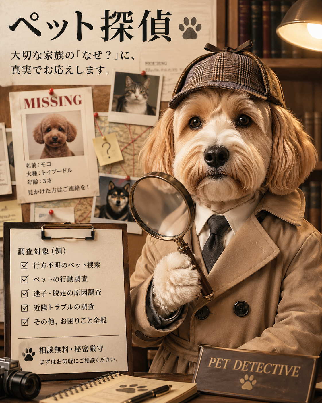 ペット探偵はあくまで「動物の捜索専門」。浮気調査や人探しは対象外です(これは通常の探偵業の分野)。